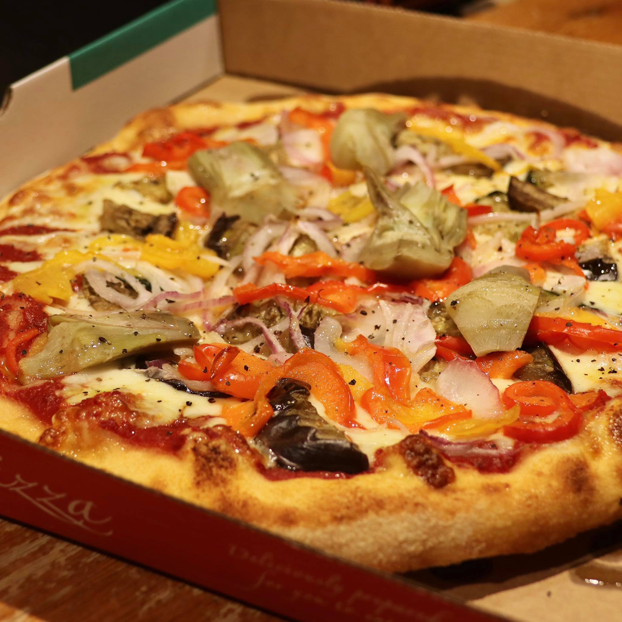 Half-moon folded pizza filled mozzarella cheese, ham and mushrooms topped with a dash of tomato sauce.