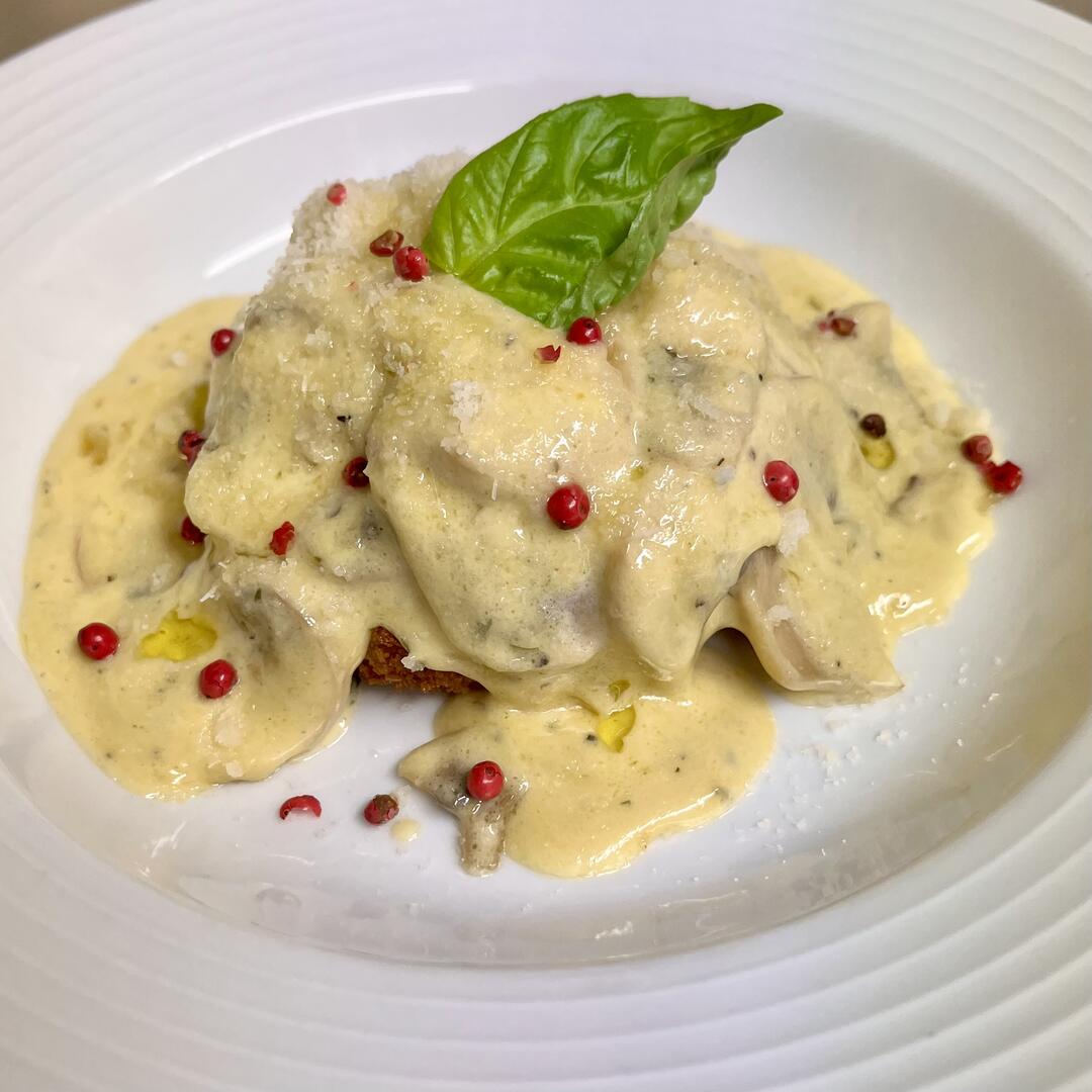 Fish cake specially prepared with a rich and creamy mushroom sauce.