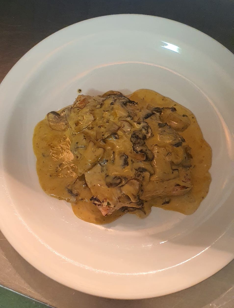 Escalope of pork, finished with a delicious white wine, mushroom cream sauce, served with vegetables and potatoes.