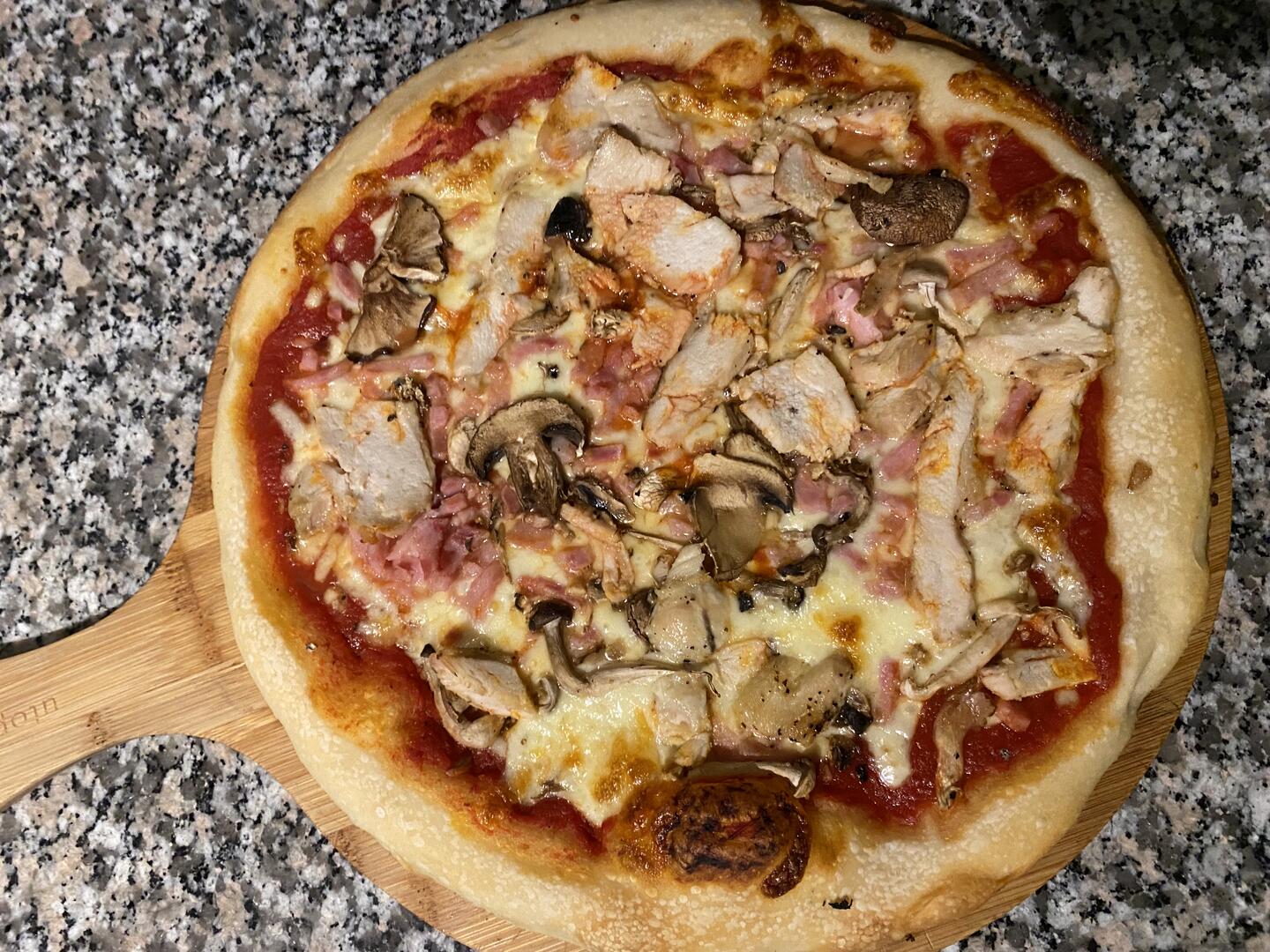 Tomato sauce, mozzarella cheese, grilled chicken, ham and mushrooms.