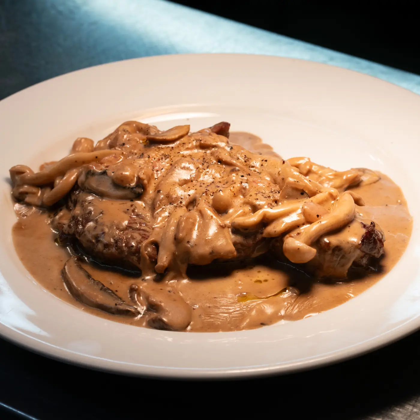 Prime Steak flambe with brandy, red wine, mushrooms, mustard and cream sauce, served with vegetables and potatoes, grilled to your liking.